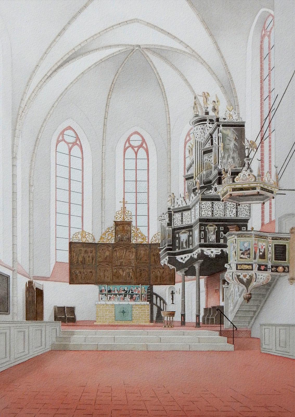 Die besten Dinge entwickeln sich manchmal ungeplant. Im Mai nahm das holländische Künstlerehepaar Henk und Marianne Terwal an der Abendvesper im Kloster Lüne teil. Beim gemütlichen Beisammensein nach dem Gottesdienst zeigte Henk Terwal dem Konvent und Gästen seine Mappe mit Aquarellen überwiegend aus niederländischen Kirchen. Die Betrachter waren fasziniert, ebenso die beiden Besucher von der Schönheit des Klosters.
